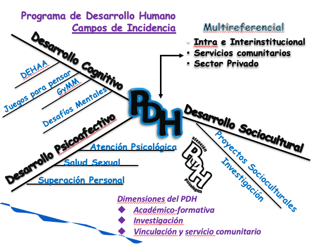 El siguiente diagrama muestra las dimensiones del Programa de Desarrollo Humano y sus campos de incidencia. Cabe señalar, que entre el 2003 y 2005 se llevó a cabo un proyecto de investigación que permitió fundamentar teórica y metodológicamente, todas las acciones y subprogramas que integraron a lo que reconocemos como PDH.